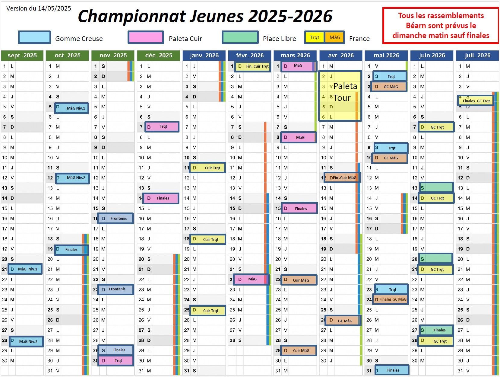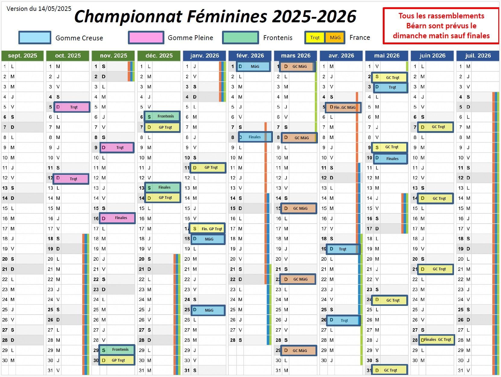 La saison 2025-2026 pour les M19, M22 et séniors se déroule tout au long de la saison à partir de septembre en suivant le calendrier de la saison ci-contre.
