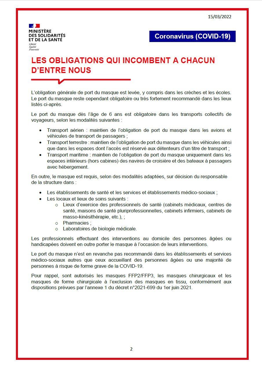 Le port du masque à partir de l’âge de 6 ans reste obligatoire dans les transports en commun. Le masque est requis dans les établissements de santé et médico-sociaux ainsi que dans les lieux d’exercice des professionnels de santé (cabinets médicaux, centres de santé, maisons de santé pluriprofessionnelles, cabinets infirmiers, cabinets de masso kinésithérapie…), dans les pharmacies et dans les laboratoires de biologie médicale.