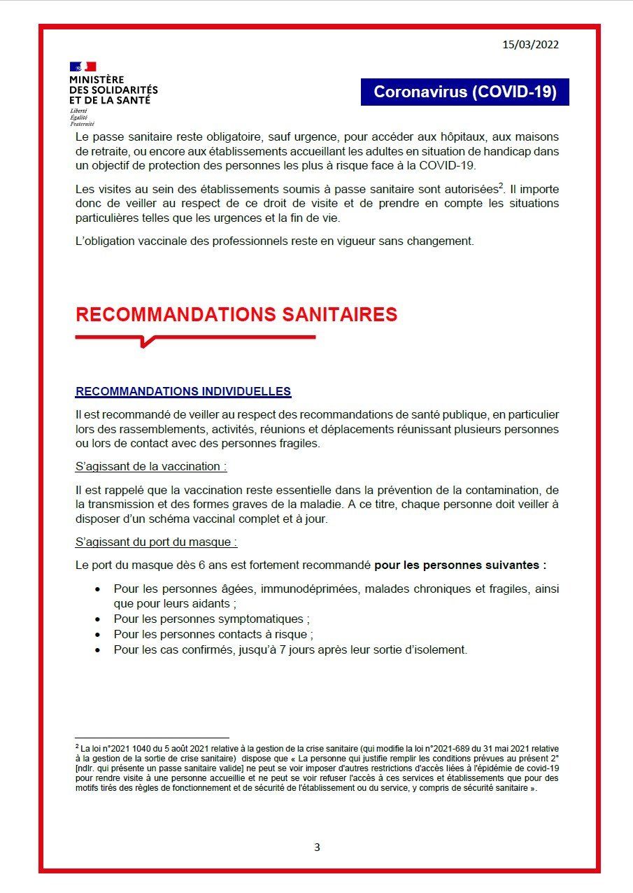 L’obligation de présentation du Pass Sanitaire est quant à elle maintenue pour accéder aux établissements de santé et médico-sociaux.